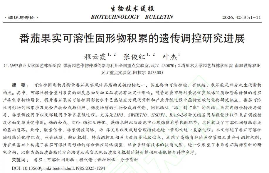 近日,华中农业大学叶杰团队在《生物技术通报》发表了题为《番茄果实可溶性固形物积累的遗传调控研究进展》的文章。本文基于近年来番茄果实品质形成机制的研究进展,系统梳理了可溶性固形物的化学组成、代谢途径、转运机制及其遗传调控网络,重点探讨了高糖相关QTL位点、现代育种策略、基因编辑技术的应用潜力以及多组学整合分析在番茄风味改良中的前景,以期为未来高风味番茄品种的定向选育提供理论参考与实践指导。
