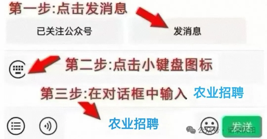 第二步:点击手机界面键盘然后输入农业招聘四个字,点击发送就可以获取想要的报名登记表等啦~