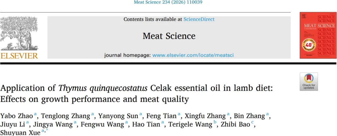 内蒙古农业科学院薛树媛研究员团队明确五脉百里香精油在羔羊日粮中的应用:对生长性能及肉品质的影响