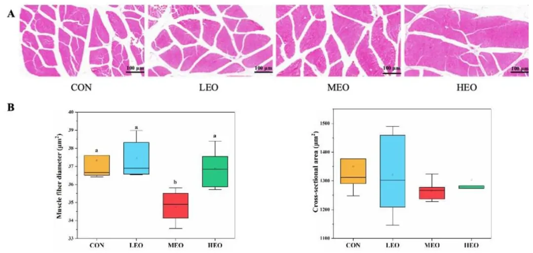 注:CON(对照组,基础日粮 + 0 mg/kg TEO)、LEO(低剂量组,基础日粮 + 200 mg/kg TEO)、MEO(中剂量组,基础日粮 + 400 mg/kg TEO)、HEO(高剂量组,基础日粮 + 600 mg/kg TEO);标有不同字母的箱体表示组间差异显著(P<0.05)。