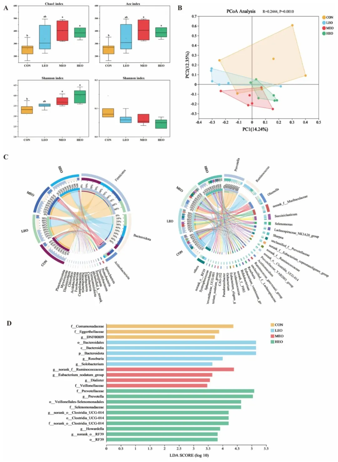 图 2 五脉百里香精油(TEO)对羔羊瘤胃菌群多样性及组成的影响