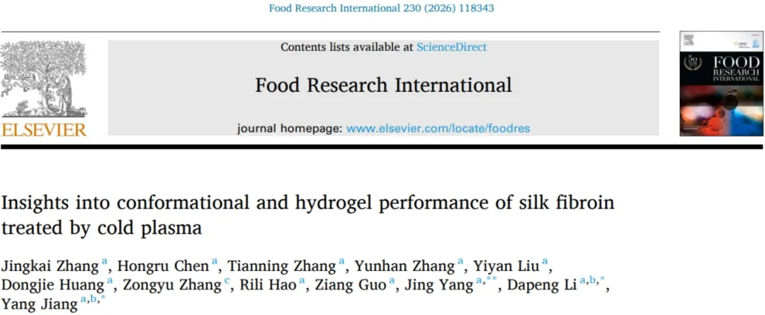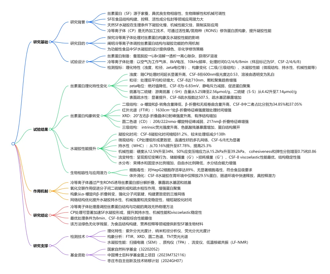 研究背景丝素蛋白作为家蚕蚕丝来源的天然生物聚合物,兼具优良的生物相容性、可调的生物降解性、机械强度及加工性能,可制成薄膜、纤维、海绵和水凝胶等多种形态,近年来在食品科学领域备受关注,广泛应用于功能成分递送、可食用涂层、活性降解包装以及生物活性化合物与益生菌的纳米包封等场景,在生物医学领域也被证实是伤口修复和癌症治疗的潜力平台,且我国成熟的养蚕业为其提供了可持续且经济的供应保障。丝素蛋白分子含重复疏水氨基酸序列,在适宜条件下可自组装形成富含 β- 折叠的结构,进而构建物理或化学交联的水凝胶网络,这类水凝胶高含水量、生物相容性佳,是细胞包封和生物活性分子控释的理想支架,但未修饰的丝素蛋白水凝胶在生理条件(如中性 pH、37℃)下存在凝胶化动力学缓慢、机械性能欠佳的问题,即便在高浓度(≥4% w/v)下,凝胶化也可能需要数天至数周;虽有升温、加离子、聚合物共混等加速溶胶 - 凝胶转变的策略,化学交联剂可提升凝胶强度却可能引入细胞毒性,酶促交联温和但成本高、批次差异大,现有物理修饰策略对凝胶性能的改善效果也有限。冷等离子体作为一种非热加工技术,可通过产生活性氧和氮物种(RONS)对底物进行物理改性,近年来其改变蛋白质构象、提升凝胶强度的特性在蛋白质修饰技术中展现出潜力,已有研究表明冷等离子体处理大豆分离蛋白或鱿鱼鱼糜后,α- 螺旋含量降低、β- 折叠和无规卷曲含量增加,流变学行为和凝胶强度显著改善,形成更致密均匀的三维网络,为无试剂、非热调控凝胶性能提供了可能,基于此,本研究深入分析冷等离子体处理对丝素蛋白结构和功能特性的影响,旨在提升其在食品工业中的适用性。图文赏析