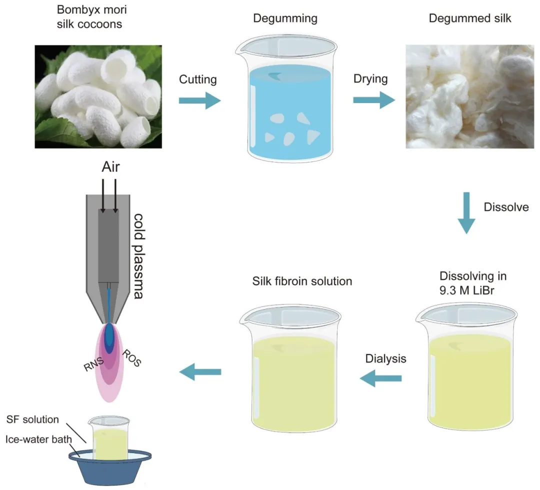 图 1 丝素蛋白的制备及冷等离子体改性处理流程