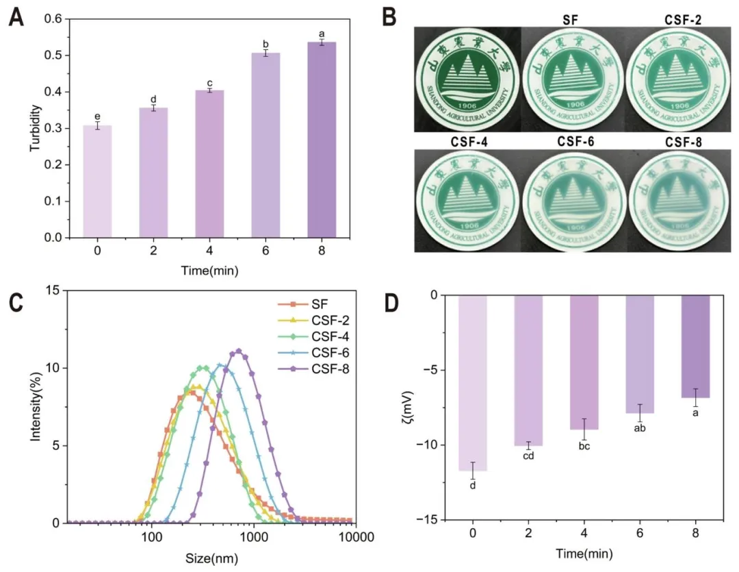 图 2 冷等离子体处理 0、2、4、6、8 分钟后丝素蛋白(SF)溶液的浊度(A)、浊度直观图(B)、粒径分布(C)及 ζ- 电位(D)