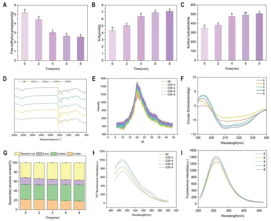 图 3 冷等离子体处理 0、2、4、6、8 分钟后丝素蛋白的游离巯基(-SH)含量(A)、二硫键(S-S)含量(B)、表面疏水性(C)、傅里叶变换红外光谱(D)、X 射线衍射图谱(E)、圆二色谱(F)、二级结构组成(G)、硫代黄素 T(ThT)荧光光谱(H)及 intrinsic 荧光光谱(I)