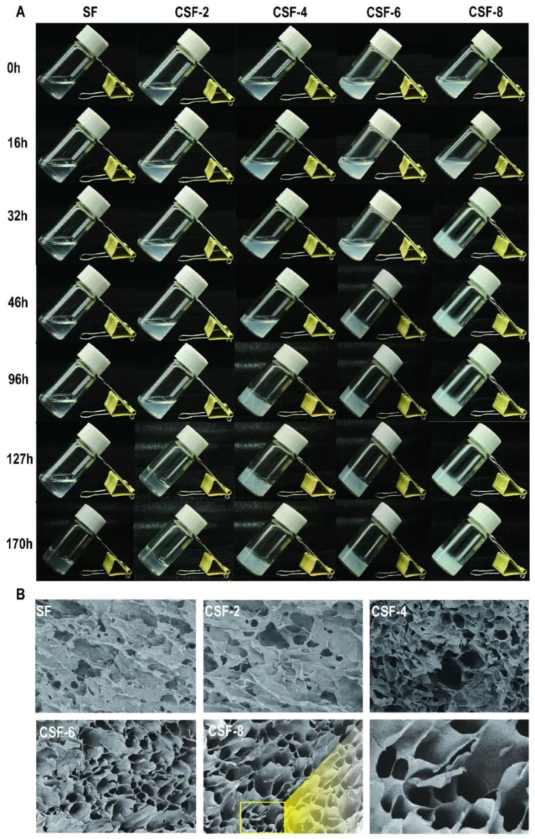 图 4 不同冷等离子体处理组丝素蛋白溶液(4%,w/v)在不同时间点的动态外观变化(A);丝素蛋白(SF)及冷等离子体处理组(CSF-2、CSF-4、CSF-6、CSF-8)冻干水凝胶的扫描电镜(SEM)图像(放大倍数 100×)(B)