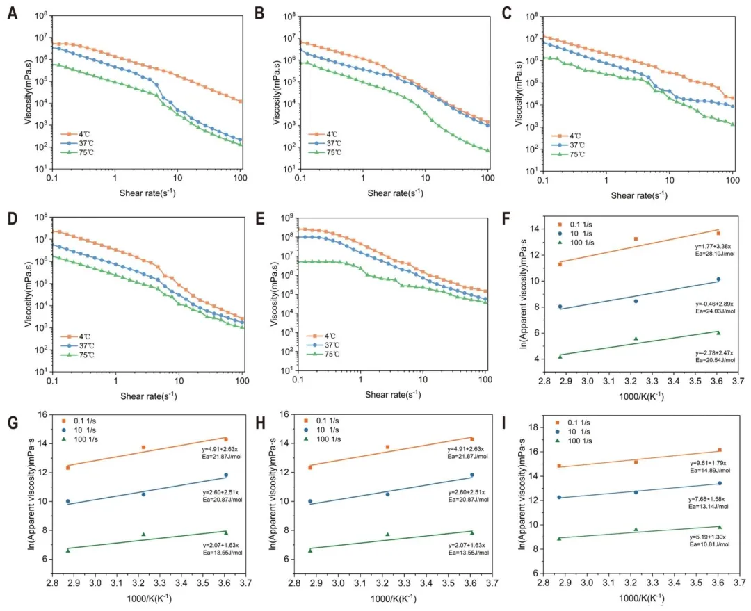 图 6 温度对不同冷等离子体处理时间(0、2、4、6、8 分钟)丝素蛋白表观黏度的影响(A-E);不同处理时间和剪切速率下丝素蛋白水溶液黏度的自然对数(lnη)与温度倒数(1000/K)的关系,实线为基于阿伦尼乌斯方程的拟合曲线(F-I)