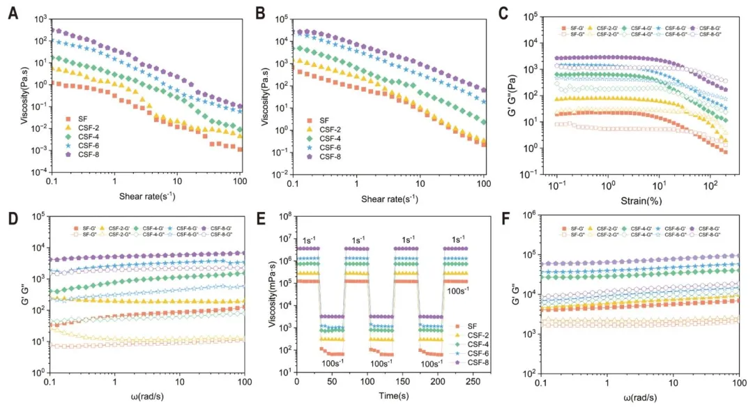 图 7 25℃下冷等离子体处理组丝素蛋白水溶液(4%,w/v)的表观黏度(A);25℃下不同处理时间冷等离子体处理组水凝胶(4%,w/v)的表观黏度(B);25℃下丝素蛋白水溶液的流变学特性:储能模量(G')和损耗模量(G'')的应变振幅扫描依赖性(角频率:6.28 rad/s)(C);黏弹性模量(G' 和 G'')(D);触变性随时间扫描的变化(E);25℃下不同处理时间冷等离子体处理组水凝胶的黏弹性模量(G' 和 G'')(F)