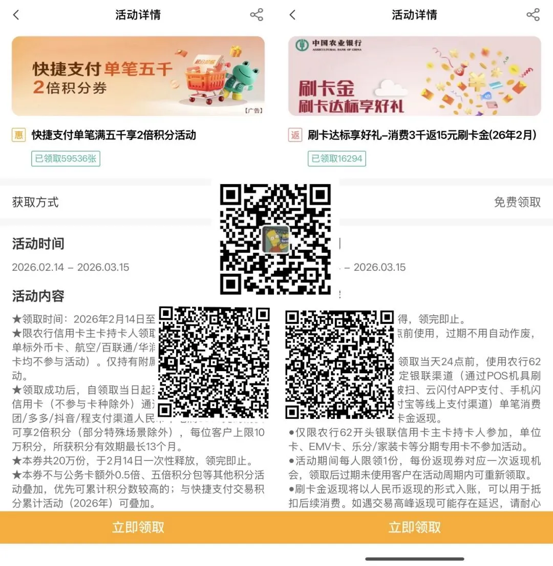 领了过十几分钟再去刷卡。两倍积分需要vs zfb等渠道。15元需要云闪付通道