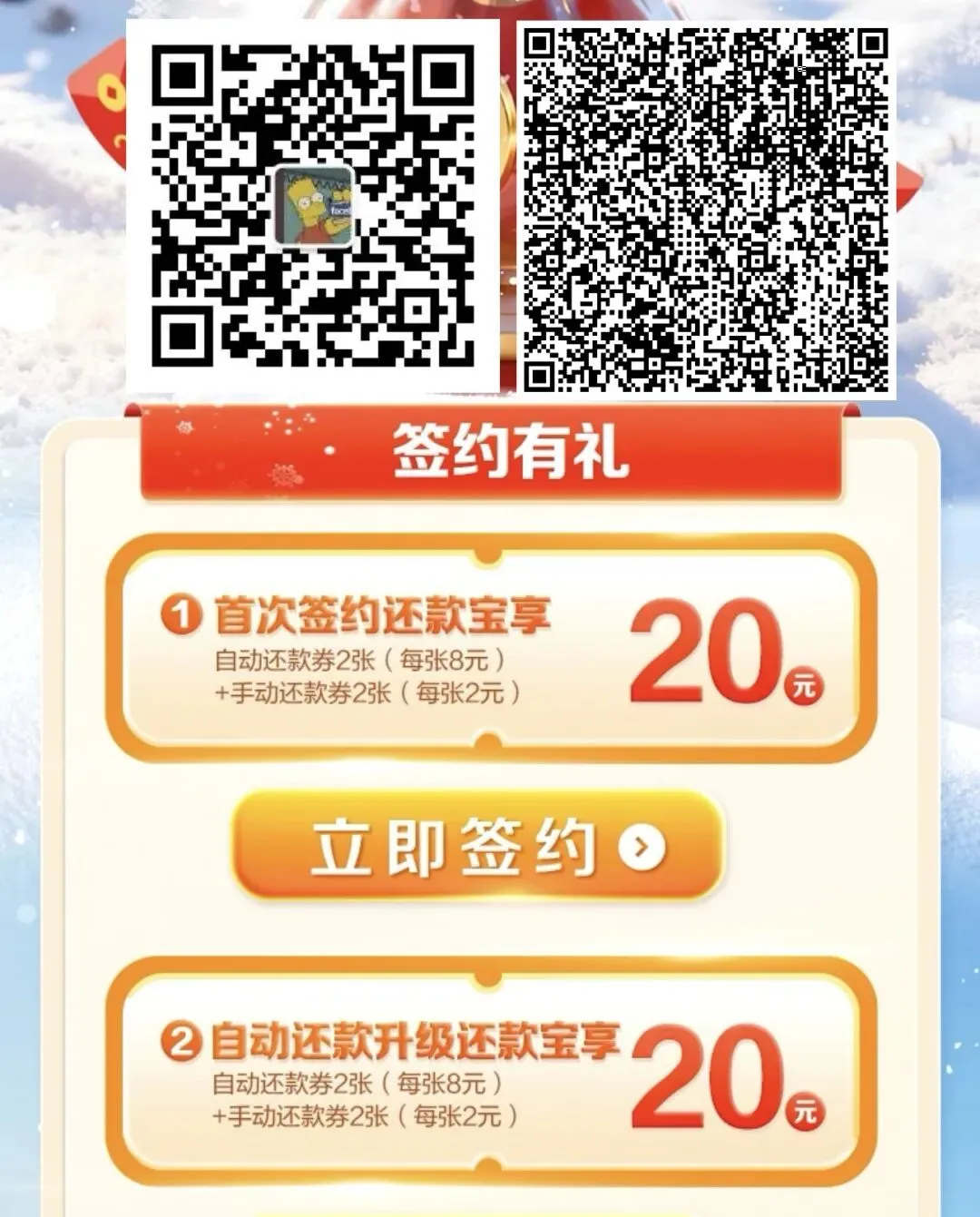 扫码,首次签约自动还款或首次升级还款宝,得自动还款券8*2+手动还款券2*2