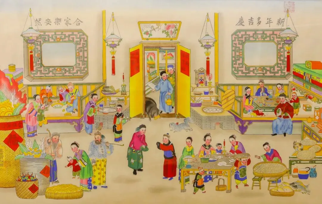 “家”在中国人心目中占有十分重要的地位,和谐地处理家庭关系是中国人处世的出发点,家庭和谐幸福也是人们最美好的愿望与追求。图中大门敞开,门上贴“忠厚传家远,诗书继世长”对联一幅。大门之内一家人,包饺子,煮饺子,蒸馒头,吃年夜饭,男女老少,其乐融融,红红火火,喜庆祥和。