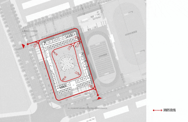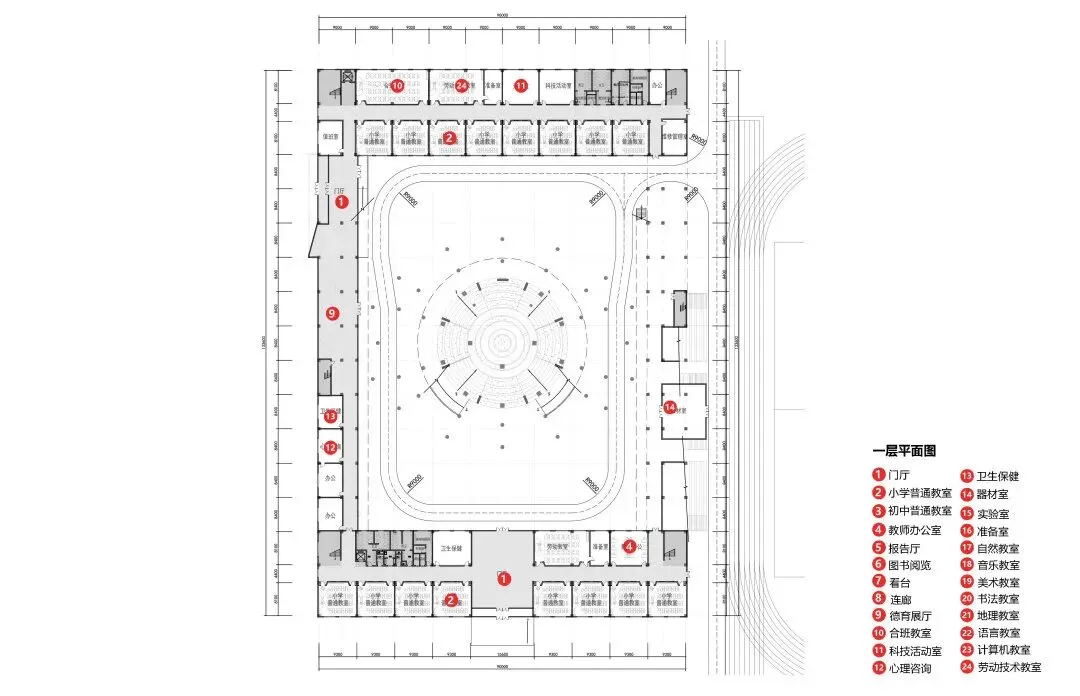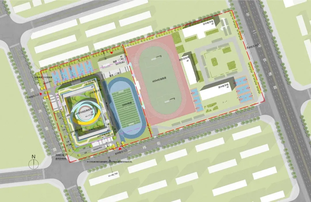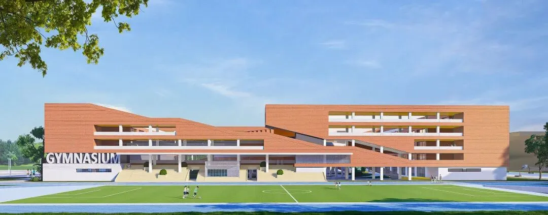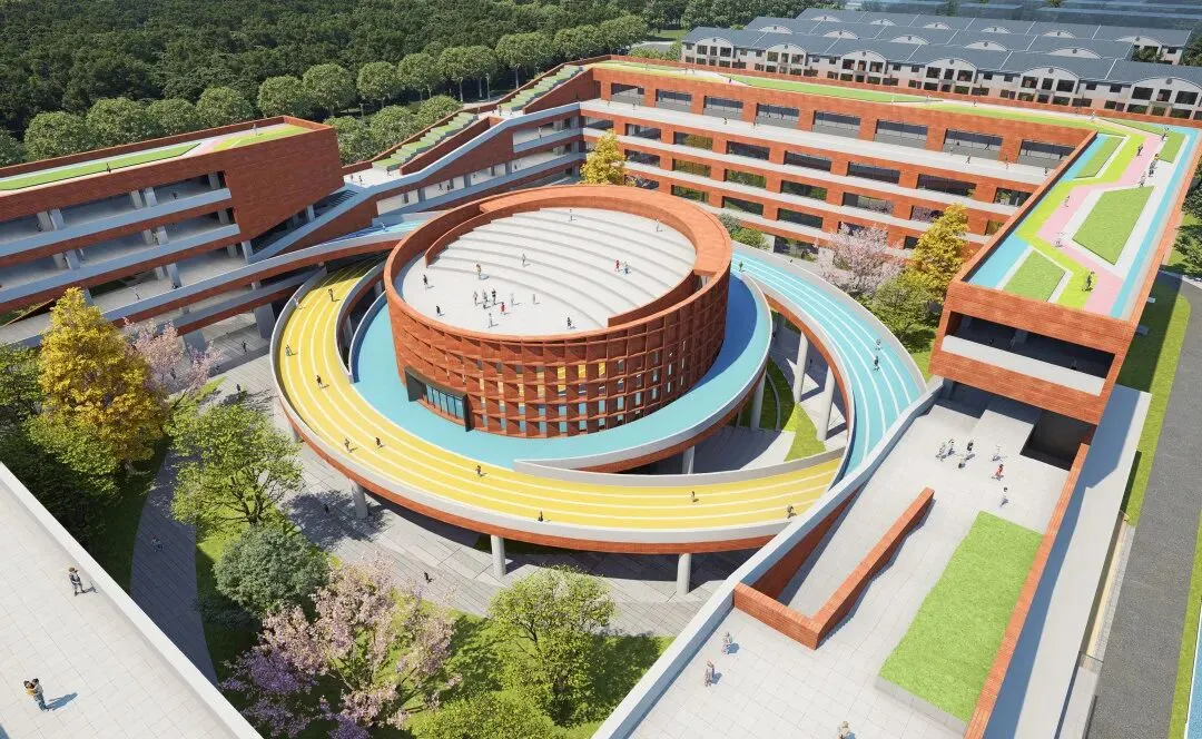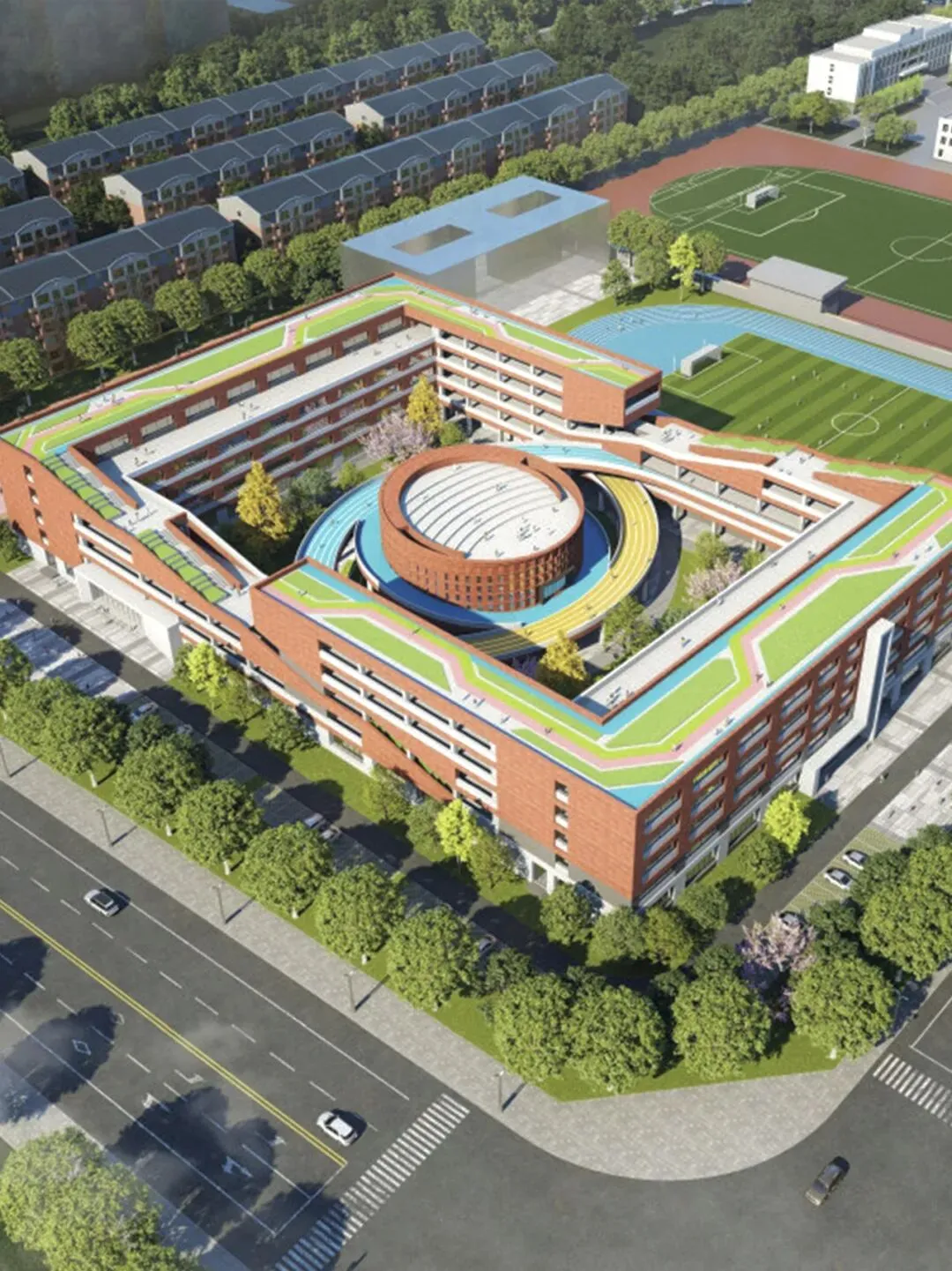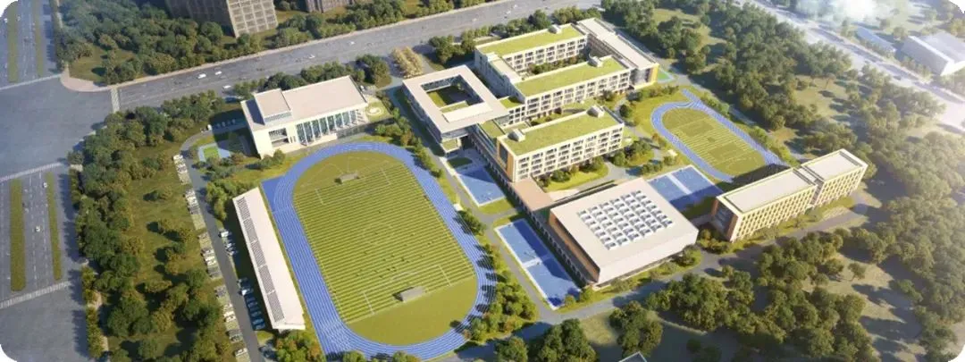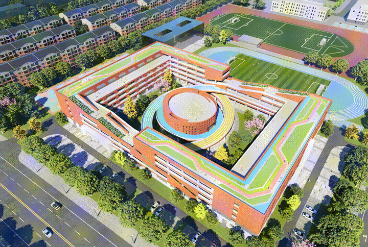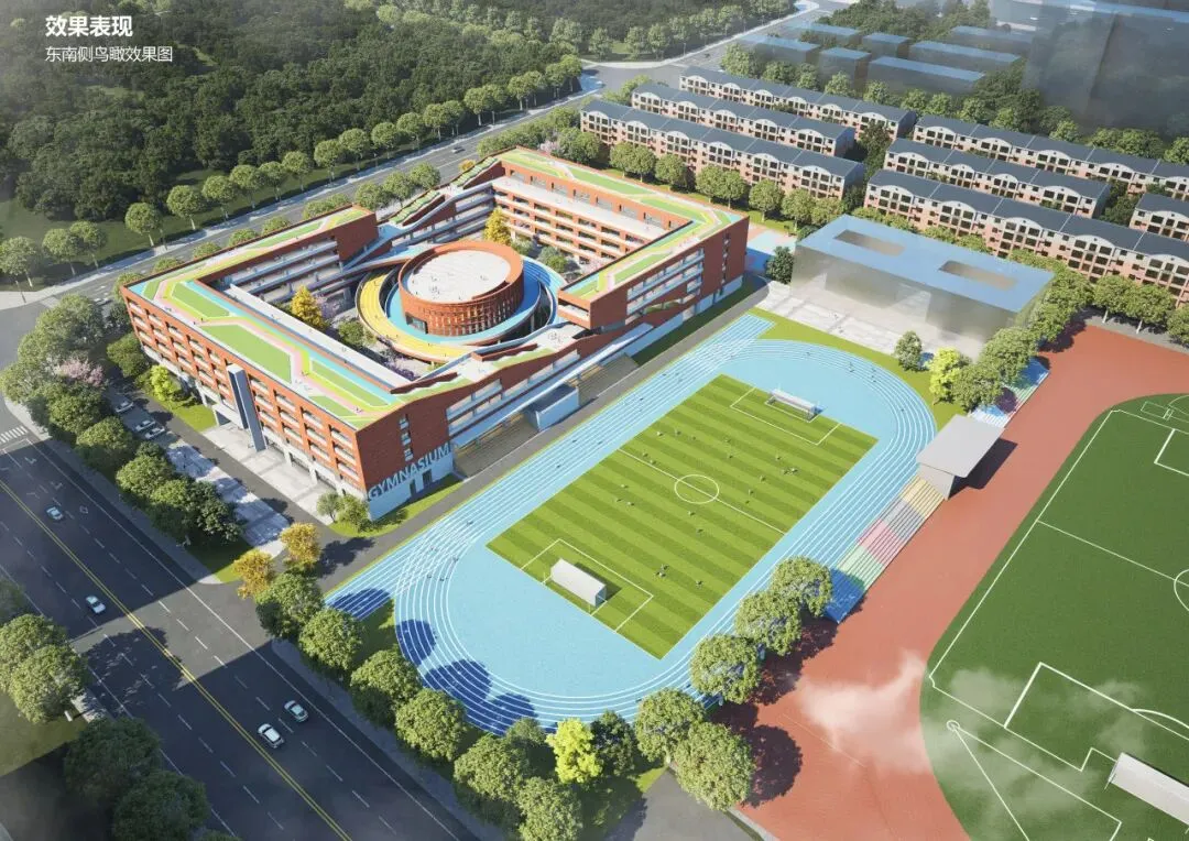 The functional layout of the campus is scientific and reasonable, forming a spatial pattern of "teaching in the west and body in the east". The west and south sides of the project site are adjacent to urban roads. A 300-meter standard playground will be set up on the east side of the site, The school is laid out in a square shape as a whole.
