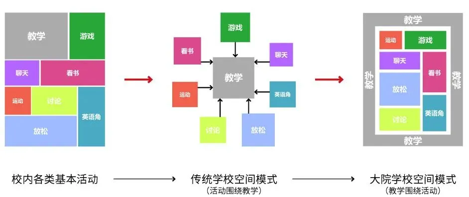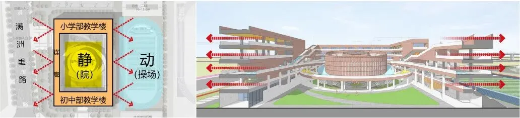 传统的学校空间以教学为主,各类活动空间围绕教学展开,而本次设计我们提出“乐学大院+立体游园”的设计理念,以大院学校空间模式为依托,打破传统学校“教室+廊子”的单一平面围合形式,在室内外多维度拓展出满足当代学生的活动场所。让教学空间围绕活动空间布置,形成“学院”围绕“乐园”的校园空间模式,激发学生学习兴趣,实现教育资源的高效共享。