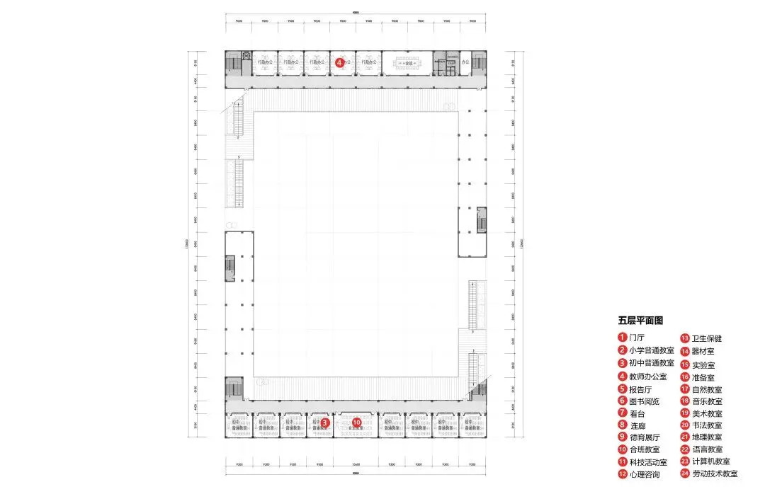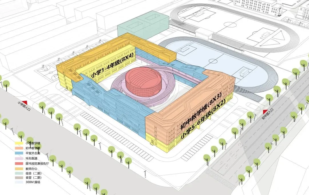 校园形成 "西教东体" 的科学合理空间格局。教学楼整体设置于场地西侧,便于就近在项目用地西侧和南侧临城市道路组织出入口。场地东侧设置300m标准操场,并预留二期宿舍、食堂、车库等建设用地。学校建筑整体呈回字形布局,北楼为小学部,南楼为初中部;高低年级相对独立分区,实现教学管理的差异化需求。