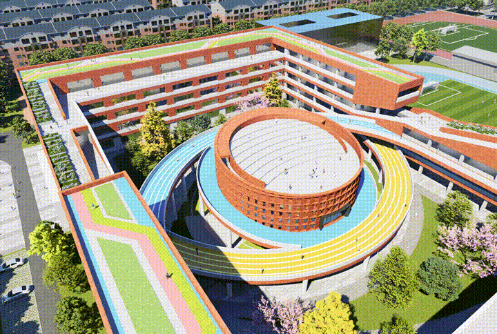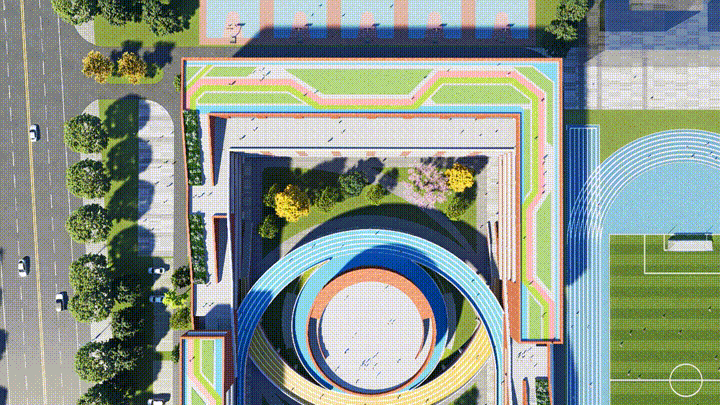 By analyzing students' behavioral activities in multiple scenarios, and in response to the activity demands of different durations of ten minutes, twenty minutes and sixty minutes, we have designed activity venues such as rooftop step platforms, vitality corridors and vitality islands. Two 300-meter running tracks serve the two teaching clusters. The yellow track runs through the primary school section, and the blue track runs through the junior high school section. The running track connects the indoor and outdoor areas, meeting the students' exercise needs during breaks and endowing the conventional corridor traffic space with new functions.