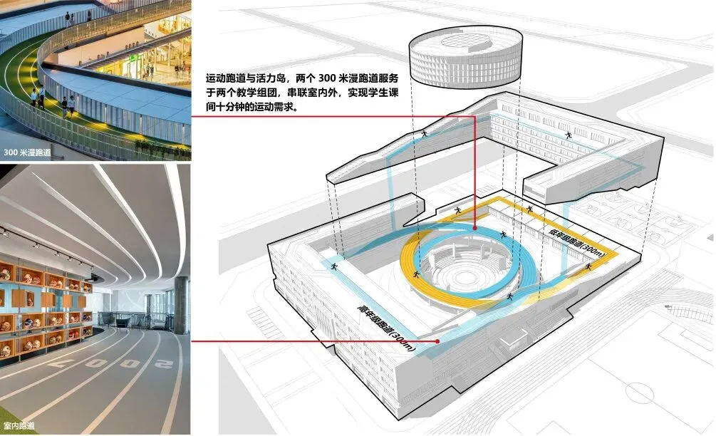 设计师通过分析多场景下的学生行为活动,针对不同时长的活动需求,对应设计了屋顶阶梯平台、活力游廊与活力岛等活动场所。两个300米漫跑道服务于两个教学组团,黄色跑道贯穿小学部,蓝色跑道贯穿初中部。跑道串联起室内外,满足了学生课间的运动需求,也把常规的连廊交通空间赋予了新的功能。