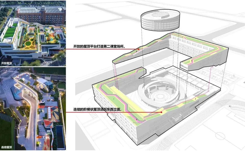 The continuous stepped roof platform is connected to the traffic corridor. The open roof platform creates a "second classroom" for students, where cold-resistant herbaceous plants are planted, making it a base for nature observation and art sketching.