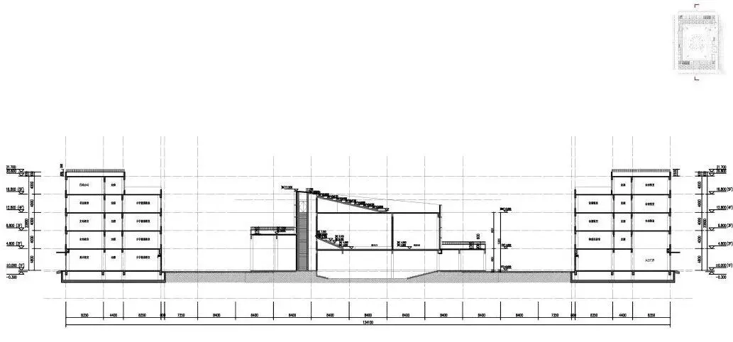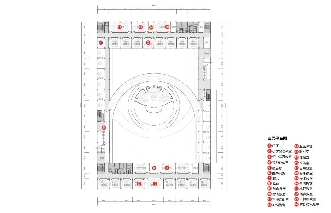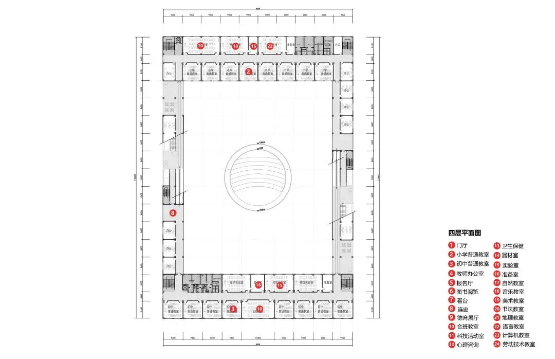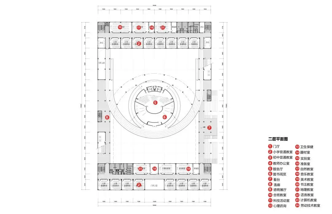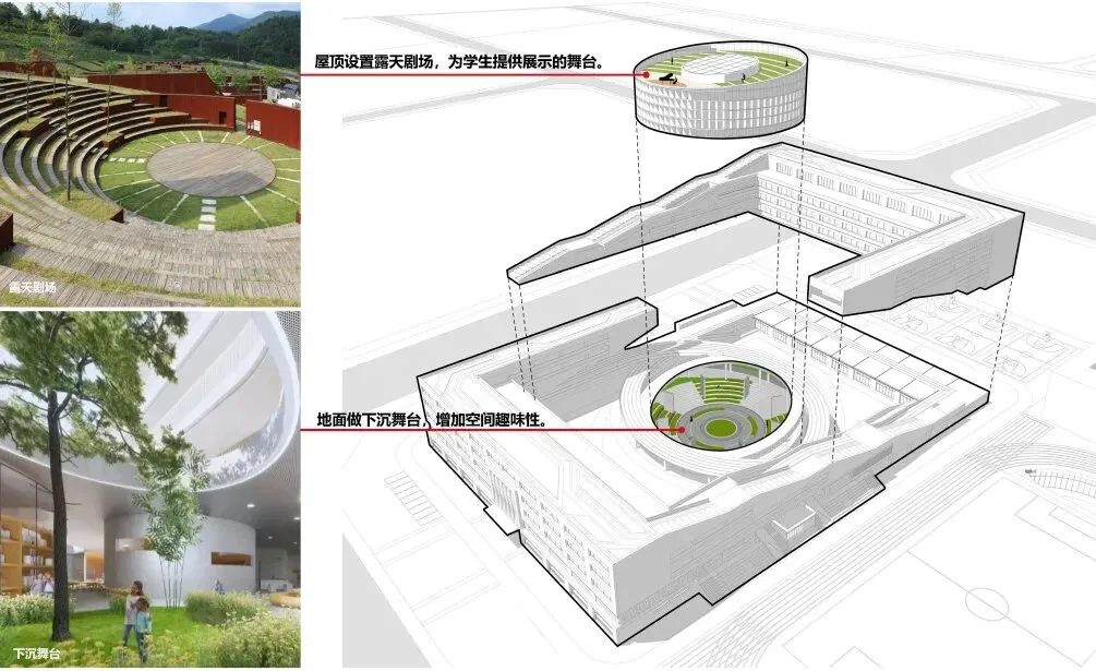 教学大院的中心部分为圆形的图书阅览兼报告厅功能,报告厅屋顶设露天剧场,为学生提供展示的舞台;报告厅底部地面做下沉舞台,增加空间趣味性,促进学生互动。