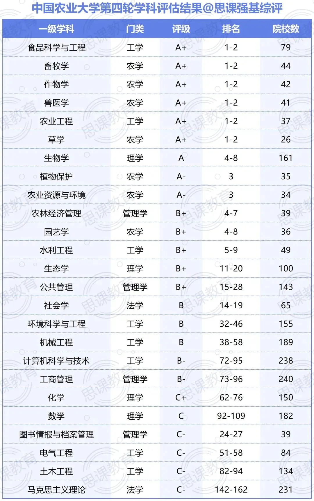在教育部第四轮学科评估中,中国农业大学上榜6个A+学科,1个A学科,2个A-学科。