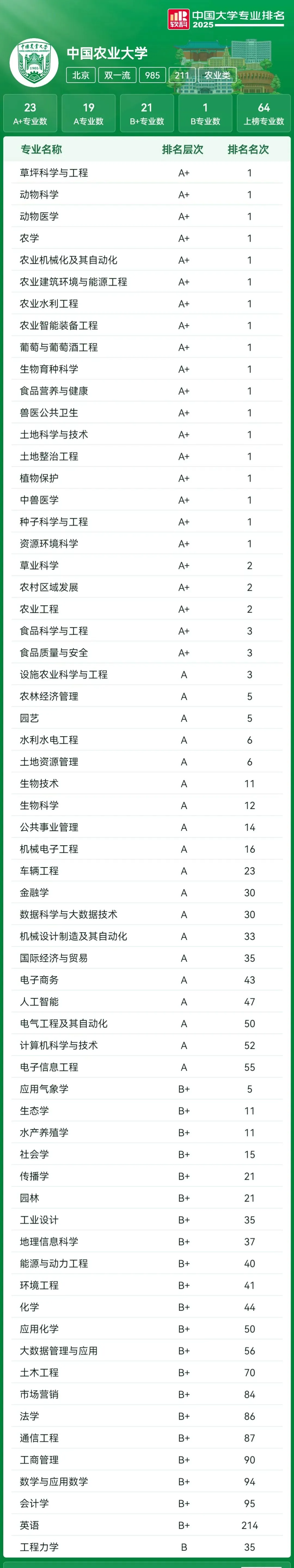 在2025软科中国大学专业排名中,中国农业大学共上榜64个专业,。其中23个A+专业,19个A专业,21个B+专业。