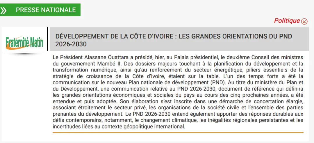 2026年初,科特迪瓦政府正式启动新一轮国家发展蓝图——Plan National de Développement 2026-2030(PND 2026-2030)。