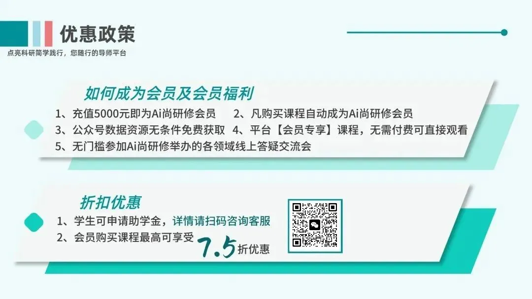 1.参加直播、视频课程费用累积进行折扣,享8.5折-7.5折 (一阶会员8.5折,高阶会员8折,尊享会员7.5折);2.参与课程组织与报名,推荐者可获得课程5%推荐现金;3.免费享受Ai尚研修会议平台中“会员免费”视频教程;4.长期免费参与针对各领域简学实用公开课(无门槛);5.免费参与开设的导师面对面线上答疑交流;6.Ai尚研修资源站分享中数据免费下载。