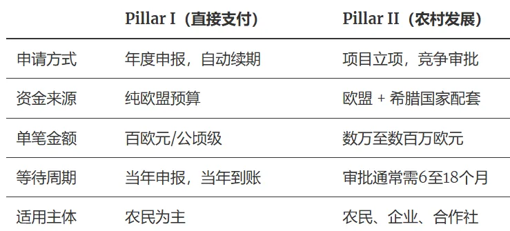 Pillar I的钱,是CAP资金池中最大的一块,也是农民感受最直接的一笔。它的基本逻辑是:你有多少合规的农业用地,每年就能申报多少面积的直接支付。资金来自欧盟预算,不需要成员国配套,每年在规定的申报窗口提交,审核通过后分批打入申报者账户。希腊在2023-2027年间,从这个支柱获得约87亿欧元的EU贡献,平均每年约17亿欧元。但Pillar I并不是一笔单一的钱,而是最多五种不同逻辑的支付叠加在一起——基础收入支持、耦合支持、青年农民补充、再分配支持、生态计划。每一种有不同的申请条件、不同的计算口径、不同的合规要求。这个系列的第三篇,会专门把这五种钱拆开来讲。Pillar II — 农村发展:项目制,竞争申请,单笔更大