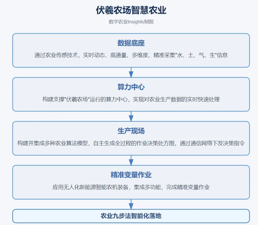 伏羲农场智慧农业概念图“伏羲农场”智慧农业体系致力于打造我国农业新质生产力。要规划3—5年后,如何让年轻人愿意积极从事农业生产,并培训年轻人的技能,向“5个人管理5万亩”“一个平台管理5亿亩”“不下地也能种好地”的目标迈进。尤其是引入AI、高端农机、生物技术等新技术,构成了新的劳动资料,为新型职业农人进入农业生产提供帮助。