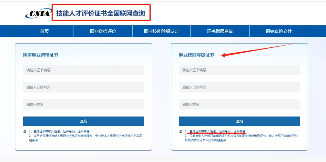 证书可登录“技能人才评价证书全国联网查询系统”,输入“证件号码”“姓名”以及“证书编号”即可查询。