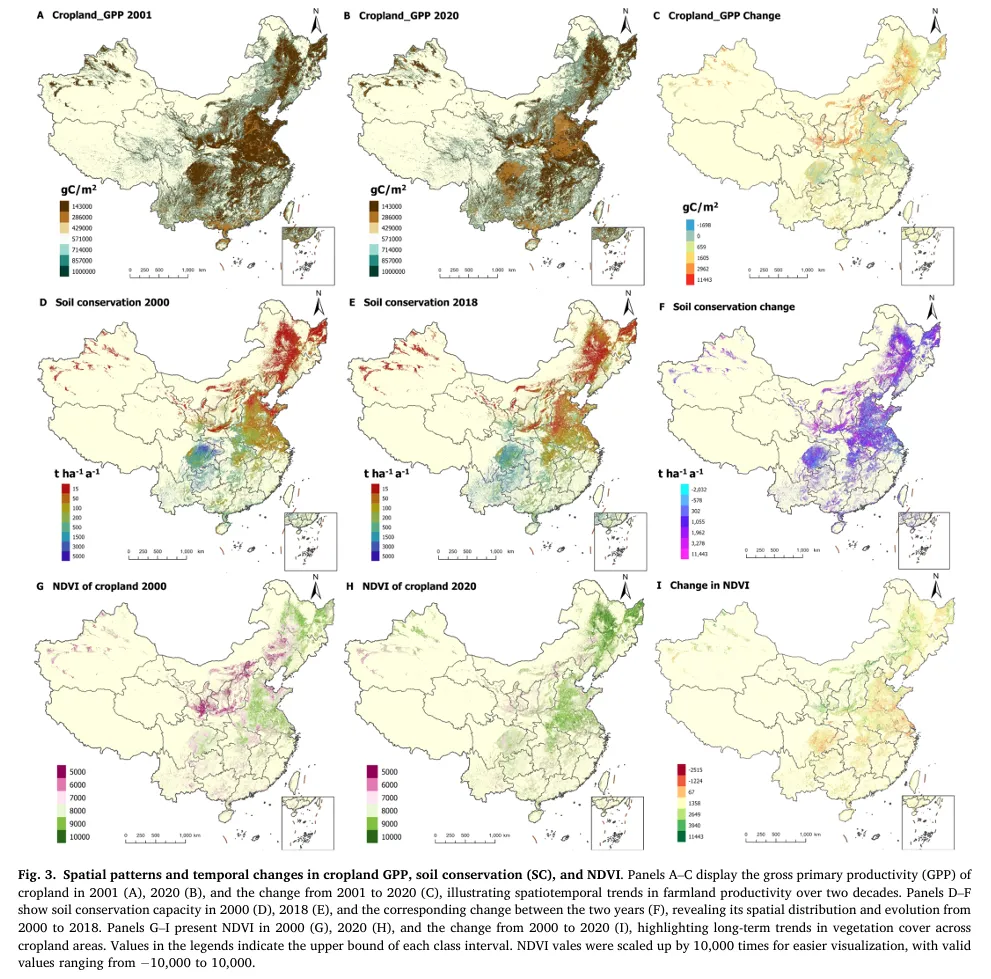 NDVI是衡量植被活动和作物覆盖的常用指标。图3g显示,2000年北方和西北地区的耕地多为粉紫色,对应低NDVI值(5000-7000),而黑龙江、河南和山东的耕地则以深绿色为主,对应高NDVI值(9000-10,000);到2020年,大多数西北和北方地区的绿色调显著加深(NDVI增至9000-10,000;图3h)。在NDVI变化图中,西北和北方地区以绿色、橙色或红色为主,表明NDVI增幅超过2000,而部分南方地区则出现下降(图3i)。这一格局反映了植被覆盖的显著增加以及中国粮食生产中心的逐步北移。MLCPs实施前,北方耕地资源有限、植被覆盖较低;而一系列工程干预措施显著改善了NDVI,为农业生产提供了更充足的资源支持。