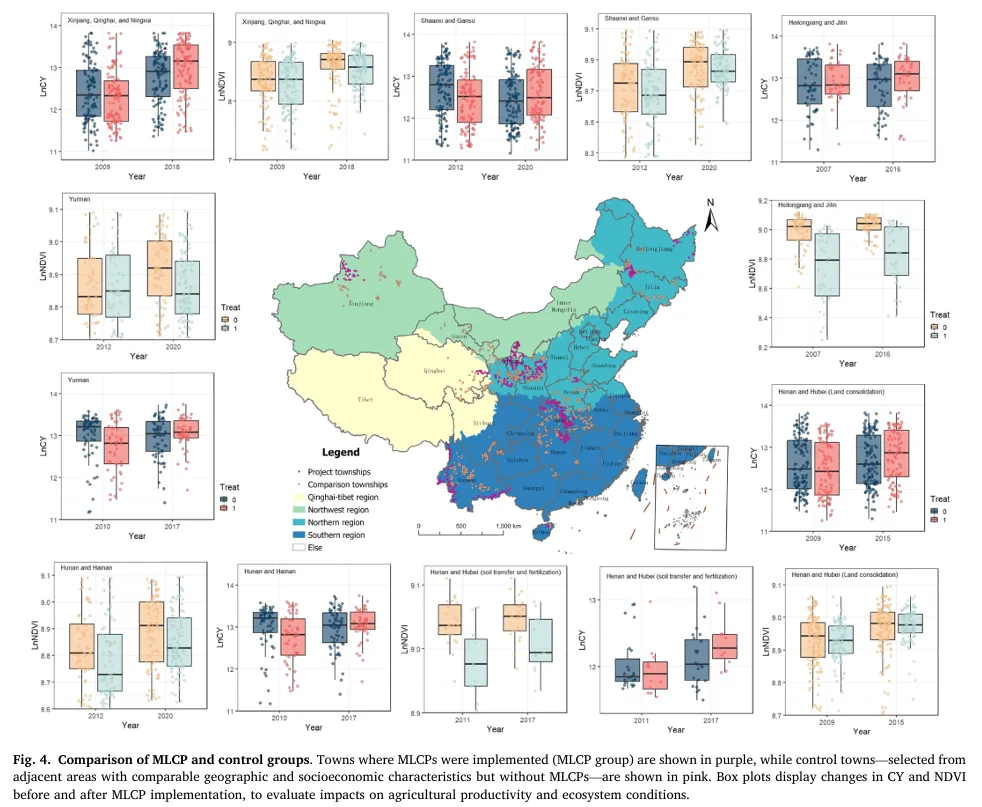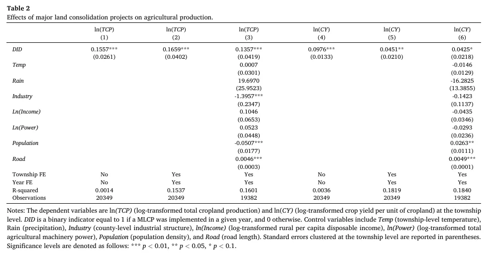 这些发现进一步证实,MLCPs的核心价值超越了数量扩张,而侧重于农田质量的实质性提升。与主要以扩大耕地面积为目标的传统土地整治不同,MLCPs致力于通过土壤修复、改善灌溉基础设施、增强气候韧性和重新连接先前分散的地块,将碎片化的小块土地转变为连片的优质农田。这种转变不仅提高了耕地的生产潜力,还为农业机械化和规模化种植创造了条件,从而支持农业生产力的持续提升。这些发现与以往研究一致,即土地整治促进了农业规模化和机械化发展。