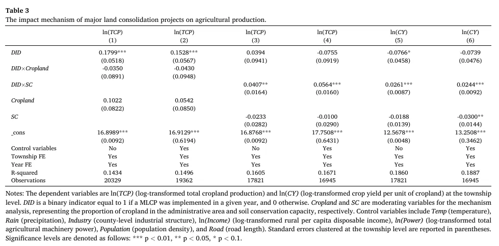 MLCPs并非主要依赖耕地扩张,而是主要通过改善土壤质量提升TCP。本研究通过在回归模型中引入行政区域内耕地比例与DID项的交互项、以及SC与DID项的交互项,进一步考察了MLCPs影响粮食生产的机制。DID×耕地比例交互项的系数在统计上不显著(p>0.1;表3模型1-2),表明耕地比例扩大带来的TCP增长并非MLCPs的显著作用渠道;表3模型3-4中,DID×SC交互项显著为正(p<0.01),表明MLCPs显著提升了SC,进而改善了TCP;相反,表3模型5-6中,DID×SC交互项也保持显著为正(p<0.01),说明SC改善显著提高了CY。