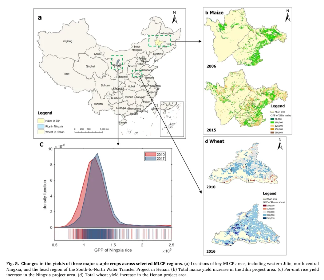 水稻单位面积产量的显著提升主要归因于盐碱地修复和农田水利工程。水稻种植依赖酸性土壤和充足的水资源供应,因此在宁夏中北部和吉林省西部实施的MLCPs专门针对盐碱地治理和农业灌溉基础设施建设,这些干预措施显著提升了土壤质量和灌溉能力,进而提高了水稻单位面积产量。为验证这些发现,本研究利用遥感数据分析了特定作物的GPP动态:吉林省玉米GPP的空间分布(图5b)、宁夏水稻GPP的核密度曲线(图5c)以及河南省小麦GPP的空间分布(图5d)。