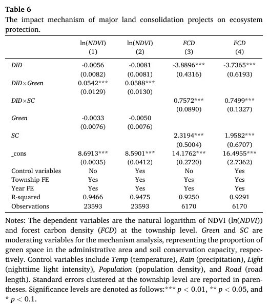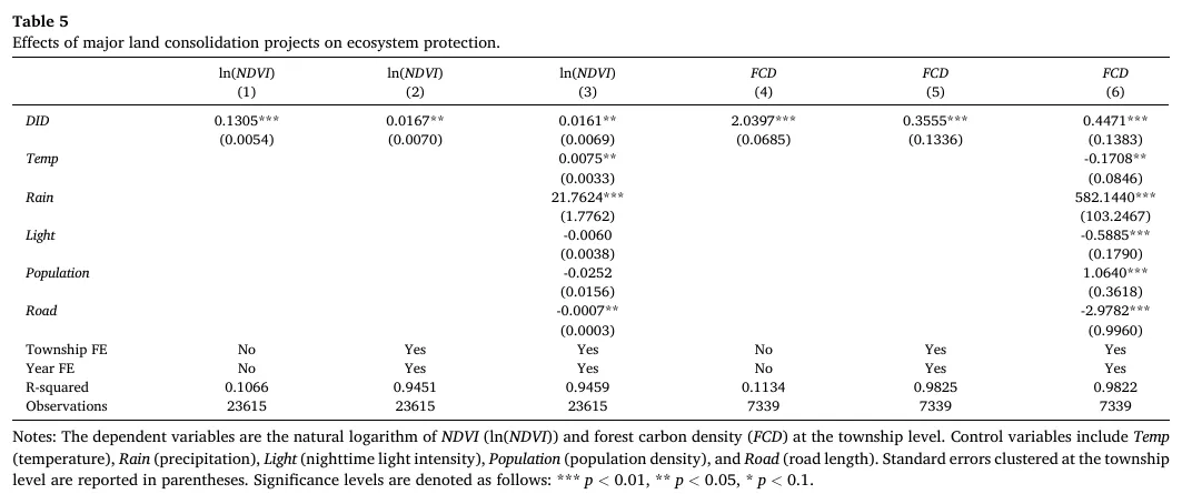 MLCPs产生了显著的生态效应。具体而言,MLCPs实施使NDVI增加1.6%(p<0.05;表5模型1-3),FCD提高0.45吨碳/公顷(p<0.01;表5模型4-6)。纳入时间和乡镇固定效应以及一系列控制变量后,这些发现依然稳健。