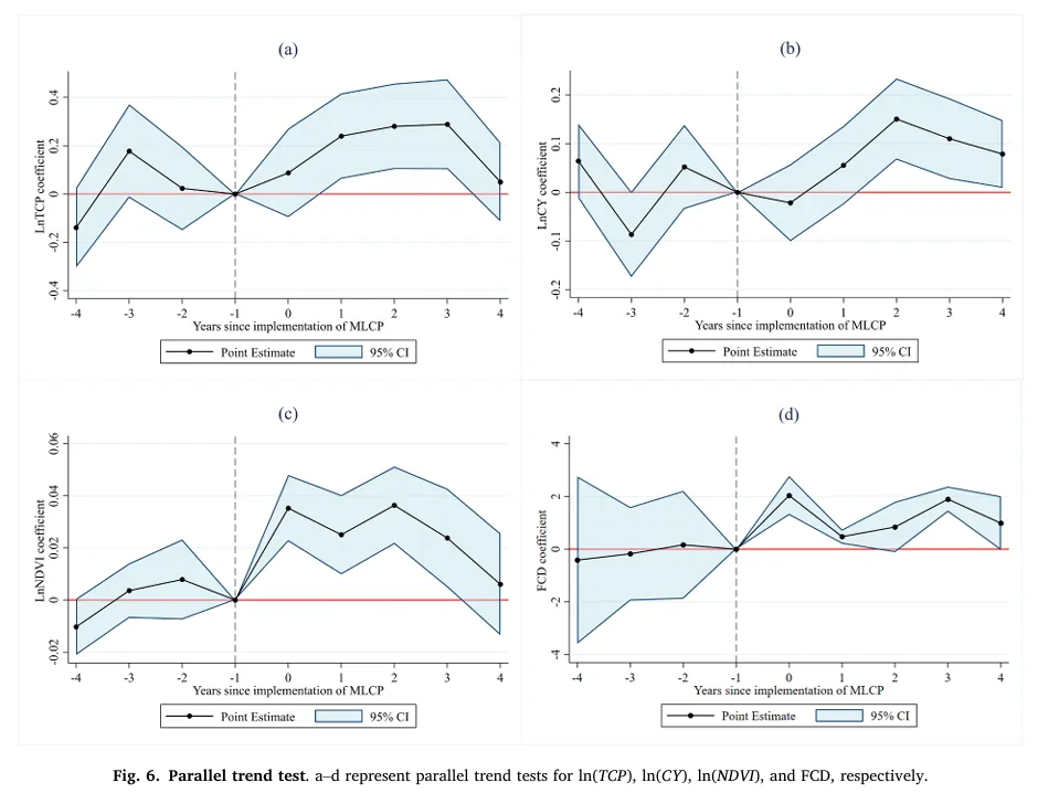 MLCPs对可持续农业生产和生态保护均产生了显著影响。在分析的实验组和对照组中(图4),黑龙江、吉林、河南(北方)、新疆、宁夏(西北)、青海(青藏高原)和湖北等省份的MLCPs实施后,单位作物产量有所提升,且项目区的产量增幅显著高于对应对照组。相反,陕西、甘肃(西北)和湖南、海南、云南(南方)等省份的对照组单位耕地产量出现下降,而实验组则呈现可衡量的改善。这些格局凸显了MLCPs对农业生产力的积极效应。从生态保护角度来看,MLCPs区域的基准NDVI值普遍低于邻近对照区域;实施后,大多数项目区的NDVI显著增加,但增幅总体小于对照组。这种差异可能源于许多MLCPs位于生态脆弱地区。为进一步验证这些结果,后续分析将采用交错DID模型,控制实验组和对照组之间的气候、社会经济和其他混杂变量。
