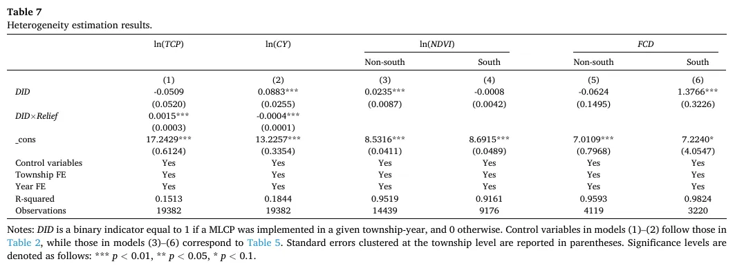 研究结果表明,MLCPs在地形起伏度较高的地区使TCP获得更大幅度的增长,而在平原地区CY的改善更为显著。具体而言,将DID变量与乡镇级地形起伏度的交互项纳入模型,结果证实存在异质性效应(p<0.01;表7模型1-2)。MLCPs通常采用科学修复技术,将生态脆弱的坡地荒地改造为高产农田,因此地形起伏度越大的地区,TCP增幅越显著;然而,这些复垦土地的CY仍低于平原农田。