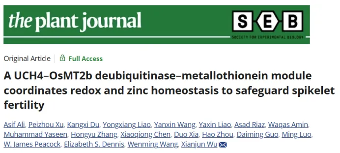 “A UCH4–OsMT2b deubiquitinase–metallothionein module coordinates redox and zinc homeostasis to safeguard spikelet fertility”文章发表在《the Plant Journal》。本研究首次鉴定到水稻中OsUCH4–OsMT2b去泛素化酶-金属硫蛋白调控模块,该模块通过协同调控氧化还原平衡与锌稳态,保障水稻小穗育性,揭示了去泛素化修饰调控水稻穗顶端退化和雄性生殖发育的全新分子机制,为水稻高产抗逆育种提供了关键靶点。