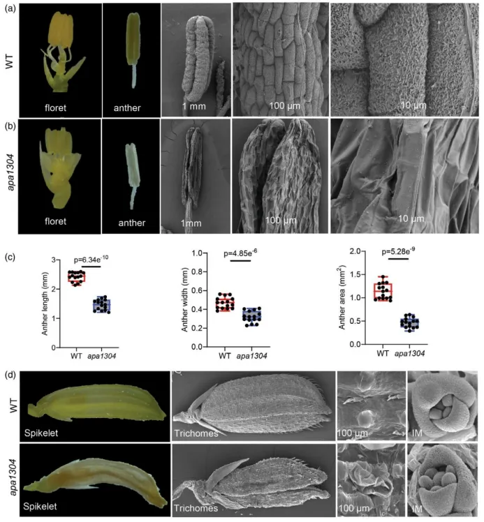 研究以EMS诱变获得的水稻穗顶端退化突变体apa1304为材料,通过图位克隆与MutMap联合分析定位候选基因;利用CRISPR/Cas9基因敲除、遗传互补实验验证基因功能;通过酵母双杂交、荧光素酶互补、GSTpull-down验证蛋白互作;结合体外去泛素化实验、多组学分析、细胞学观察、原位杂交和qRT-PCR等技术,解析基因的表达模式、酶活特性与调控通路。