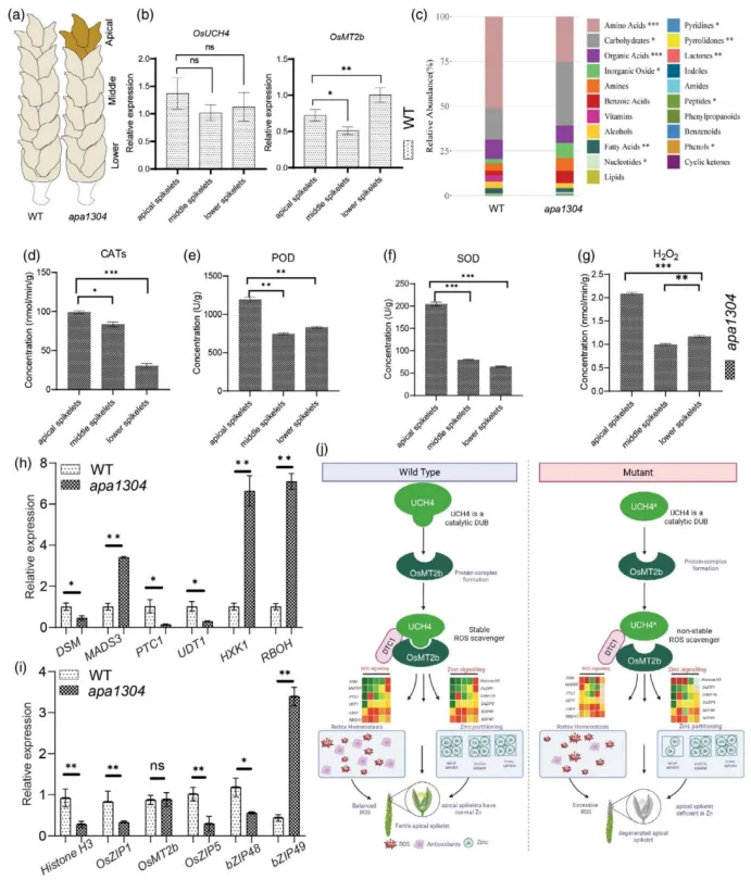 水稻穗顶端小穗退化是造成产量损失最高达52%的关键农艺性状,其遗传调控机制尚未完全解析。泛素羧基末端水解酶(UCH)家族去泛素化酶在动物生殖发育中功能明确,但在植物中的作用鲜有报道;金属硫蛋白OsMT2b虽已知参与ROS清除和锌向穗部的转运,但其上游翻译后调控机制,以及小穗退化的顶端特异性调控逻辑仍不明确。