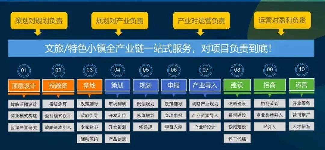 作为中国康养·文旅产业链一站式服务平台从顶层设计、投融资、拿地、策划规划、申报、产业导入、建设、招商、运营10大环节的全产业链一站式服务模式。汇集200多位拥有新思想的智库专家、300多位经验丰富的顼目操盘手,链接IP资源2600多个,进驻平台知名企业20800多家。