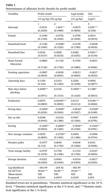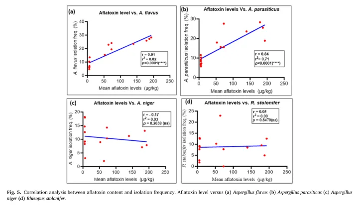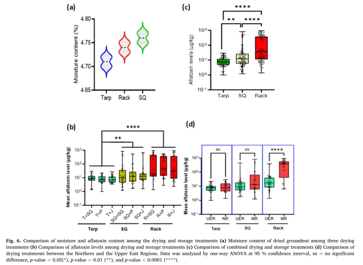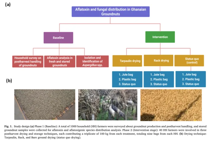 花生(Arachis hypogaea)是加纳的主要主食和出口作物。然而,黄曲霉毒素污染带来了严重的食品安全和健康风险,包括肝细胞癌、免疫抑制和儿童发育迟缓。黄曲霉毒素含量超标已扰乱花生出口,影响加纳经济。本研究探究了导致花生黄曲霉毒素污染的关键驱动因素及产毒菌株,并探索了采后防控策略。对1000户家庭的社会人口统计学数据和黄曲霉毒素数据进行Probit分析,结果显示,黄曲霉毒素含量超标与延迟收获、干燥时间不足和未分拣密切相关。分子鉴定表明,黄曲霉(Aspergillus flavus)和寄生曲霉(Aspergillus parasiticus)是主要产毒菌株,在90%以上的样本中被检出。值得注意的是,这些菌株的分离率与黄曲霉毒素浓度呈强正相关,黄曲霉的决定系数(r²)为0.81(p<0.0001),寄生曲霉的决定系数(r²)为0.71(p<0.0001)。对干燥和储存技术的进一步评估显示,花生拔起后及时摘果、分拣并在油布上干燥,相较于农户现有做法和架子干燥技术,可使黄曲霉毒素污染减少86%。本研究为农户提供了经济高效、简单易行的黄曲霉毒素防控技术。