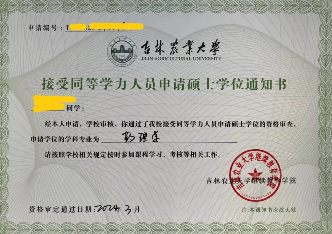 申请人通过同等学力水平认定(通过学校及国家组织的全部课程学习考核、完成学位论文、通过学位论文答辩),完成必修环节,符合学位授予条件,授予吉林农业大学硕士学位。