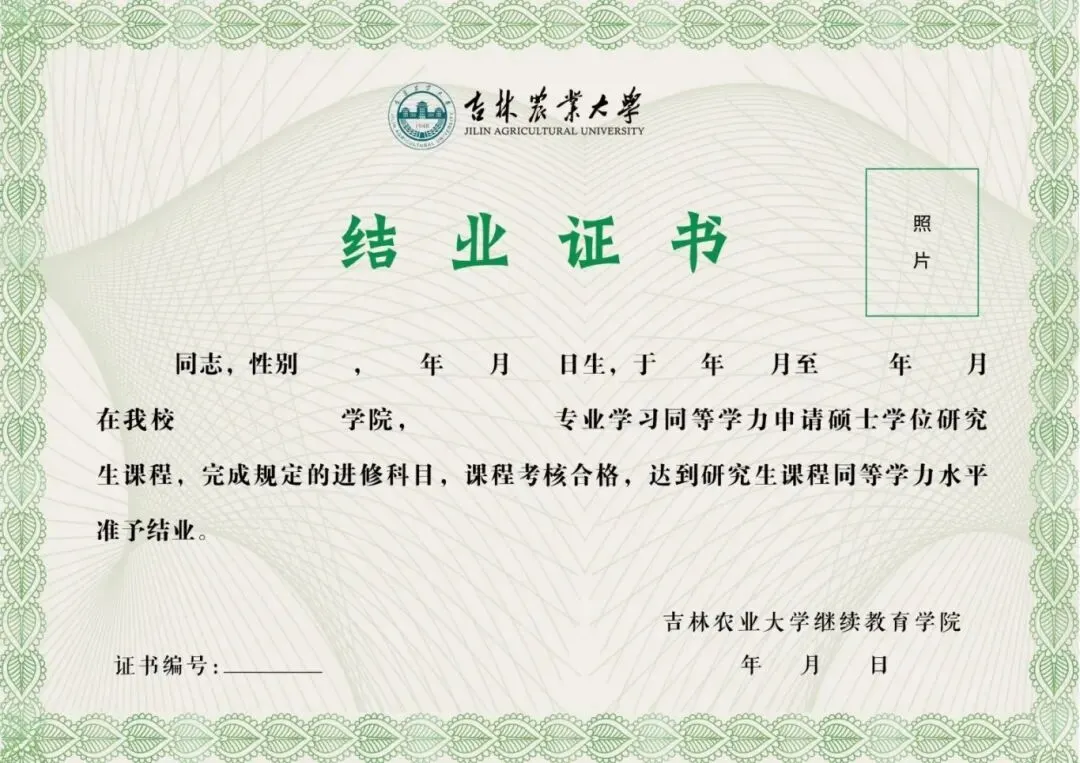 申请人修完培养方案规定的课程,考核合格者,可获得吉林农业大学研究生院认定的成绩单并颁发同等学力申请硕士学位课程水平认定证书(结业证书)。
