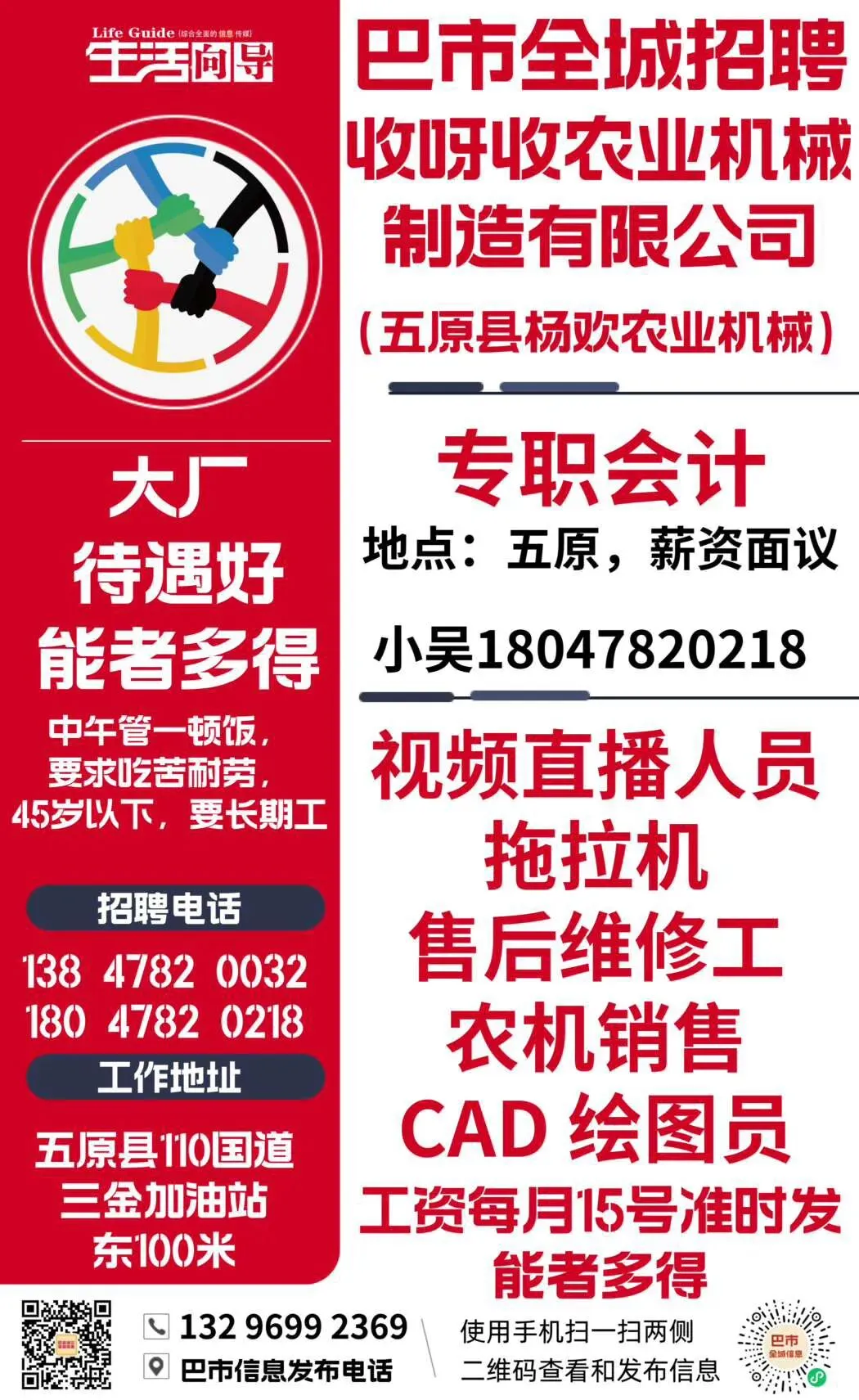 巴市五原万元招聘:收呀收农业机械 制造有限公司(五原县杨欢机械)招聘会计视频直播人员拖拉机售后维修工、农机销售、CAD绘图员