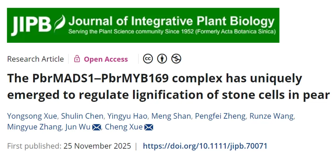 近日,《Journal of Integrative Plant Biology》期刊发表了一项来自安徽农业大学园艺学院的重要研究成果。该学院薛雍松副教授作为第一作者完成了题为"The PbrMADS1-PbrMYB169 complex has uniquely emerged to regulate lignification of stone cell in pear"的论文,首次系统阐明了梨果实中石细胞木质化过程背后的分子调控机理。