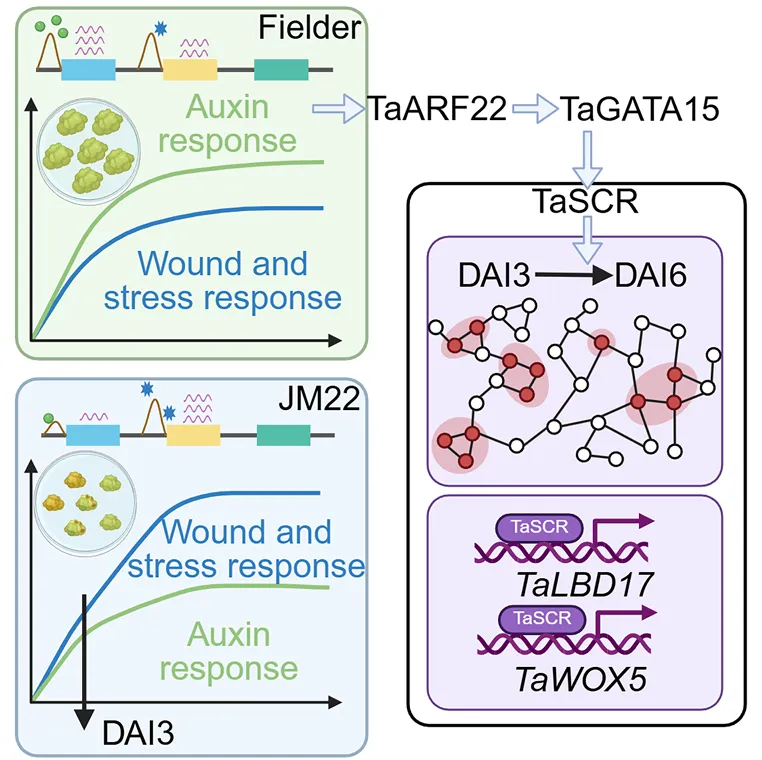 高效的植物再生体系构成了作物遗传转化与基因编辑工作的基础前提,但在小麦这类主要粮食作物中,再生能力却呈现出显著的基因型依赖特征。实验室中广泛使用的模式品种如Fielder往往具备出色的再生效率,而实际农业生产中广泛栽培的品种诸如济麦22、矮抗58等却普遍面临再生困难的困境,这种差异严重限制了优良品种进行遗传改良的进程。正因如此,深入探究不同基因型小麦再生能力差异背后的分子机理,识别并挖掘调控小麦再生的关键因子,对于突破作物遗传转化技术瓶颈兼具重要的科学价值与实践意义。