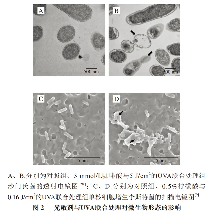 为提高UVA的灭活效率,研究人员将UVA与外源光敏剂或其他物理加工技术联合应用,发现低浓度光敏剂与UVA联合使用即可达到理想灭活效果。例如,de Oliveira等使用超声波将10 mg/mL姜黄素均匀雾化在菠菜、生菜和番茄表面,随后进行10 min UVA照射,总辐照能量为20.4 kJ/m2,结果使大肠杆菌O157:H7和单核细胞增生李斯特菌的数量从初始6(lg(CFU/cm2))减少到约3(lg(CFU/cm2))。此外,该方法对新鲜农产品洗涤废水中的细菌也具有抑制作用,仅需10 min即可将大肠杆菌和单核细胞增生李斯特菌的数量减少超过5(lg(CFU/mL)),降低了微生物交叉感染风险。不同微生物对光敏剂与UVA联合处理的反应存在差异。如图2A、B所示,3 mmol/L咖啡酸与5 J/cm2的UVA联合处理导致沙门氏菌的内部结构严重损坏,但细胞外形没有显著变化。而0.5%柠檬酸与0.16 J/cm2的UVA联合处理则使单核细胞增生李斯特菌产生显著的细胞膜皱缩和结构破坏,导致细胞膜完整性严重受损(图2C、D)。这种差异可能归因于两种细菌细胞壁和膜结构的差异性。单核细胞增生李斯特菌的细胞壁可能对光敏剂和UVA的联合作用更敏感,导致细胞膜的快速破坏。