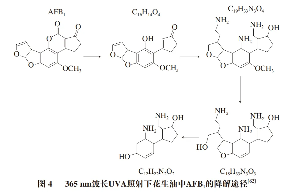 黄曲霉毒素(AF)广泛存在于花生油、粮食及其制品中,具有高毒性和高致癌性,已被世界卫生组织划为I类致癌物。其中,AFB1是毒性最强的一种,对人和动物的肝脏造成极大损伤,严重时会导致肝出血、肝硬化、肝坏死和肝癌等疾病。研究表明,365 nm波长UVA处理含AFB1的花生油样品25 min,AFB1降解率可达85%以上。由于花生油中存在大量的蛋白质、氨基酸或者其他小分子,AFB1的光降解途径非常复杂,涉及一系列复杂化学反应。Mao Jin等通过液相色谱-串联质谱分析光降解产物,提出了可能降解途径。如图4所示,AFB1在365 nm波长辐照下发生内酯环C=O键的断裂,生成C16H14O4。随后,C16H14O4与花生油中含氮化合物光解后产生的R—NH2、—NH2等小分子发生加成或取代反应,形成中间体C19H33N3O4。C19H33N3O4进一步失去甲氧基(—OCH3)生成C18H33N3O3,最终生成C12H22N2O2。此外,UVA辐照技术可持续处理食用植物油,并在15 min内降解植物油中超过95%的AFB1,且油品质未发生劣变。对于罐头食品、精麦和小麦粉,UVA同样能显著降低其AFB1水平。这些研究表明,适当的紫外照射时间和强度是决定AFB1降解效率的关键因素,且该技术在不同食品类型和AFB1浓度下均展现出良好的适用性和有效性。UVA辐照技术在去除其他毒素上同样具有潜力,石墨烯/氧化锌复合材料在365 nm波长UVA照射下可在30 min内使水中呕吐毒素降解率超过99%。研究发现,尽管羟自由基在降解过程中有一定作用,但超氧阴离子自由基和空穴的直接氧化才是毒素降解的主要机制。