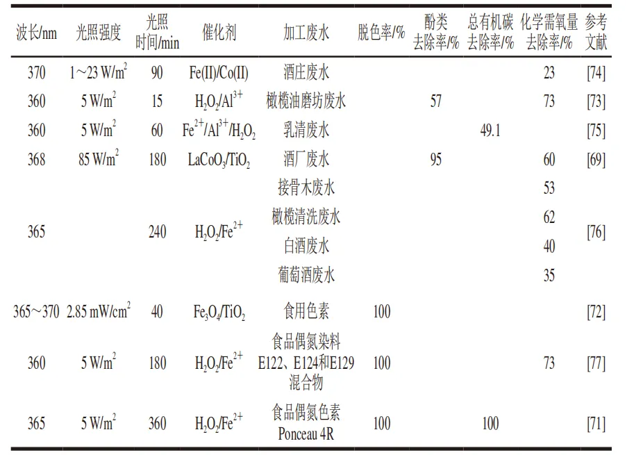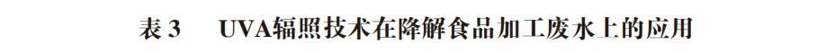 UVA通过触发高级氧化过程,如结合过硫酸盐和Fenton试剂,引发大量自由基的产生,促进难降解有机物的矿化,并灭活加工废水中的有害微生物。在橄榄油废水处理中,光-Fenton过程可去除72%的溶解有机碳,使化学需氧量达到排放标准。UVA与过硫酸盐及过渡金属(如Fe(II)或Co(II))联合使用可生成硫酸根自由基,有效灭活葡萄酒废水中的大肠杆菌、枯草芽孢杆菌、金黄色葡萄球菌和白色念珠菌,并去除高达85%的化学需氧量。在实际葡萄酒废水中,0.5 mmol/L的过硫酸盐和金属激活剂在pH 5.0的条件下,经370 nm波长LED灯照射120 min,尽管化学需氧量去除效果不如模拟废水,但仍能完全灭活废水中的微生物。在对奶酪乳清废水处理中,掺硼金刚石/铂电极结合UVA照射在pH 3.0条件下可去除49.1%的有机碳,将乳白色浑浊的废水转变为清澈的黄色溶液。尽管UVA对食品色素的降解速率略低于UVC,但两者均能在1 h内实现完全降解。值得注意的是,UVA和UVC的LED光源在食品色素降解方面效率显著优于传统汞灯,且能耗更低。因此,相较于汞灯,LED灯在食品加工废水处理中具有更高的能效和环境友好性。表3总结了UVA辐照技术在食品加工废水降解研究的成果。