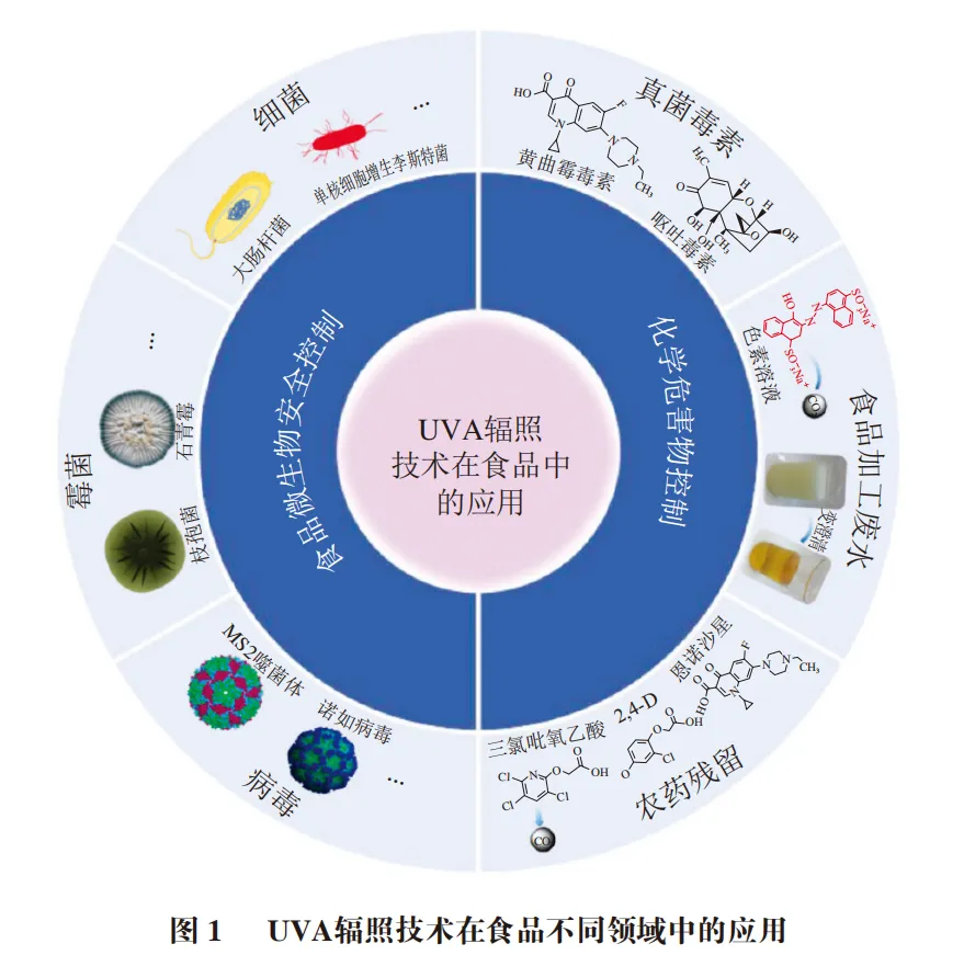 如图1所示,中国农业大学食品科学与营养工程学院的肖杰、高幸幸、张洪超*等主要概述UVA辐照技术在微生物污染物和化学危害物控制等方面的应用研究,讨论其在食品工业应用中所面临的挑战,并展望其发展趋势,以期为UVA辐照技术在食品不同领域的应用提供理论参考。